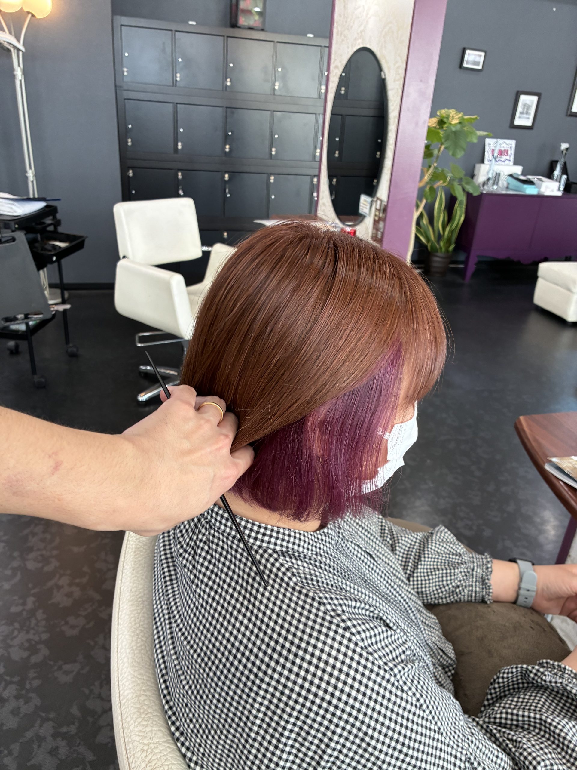 表面はナチュラルなブラウンで落ち着いた印象にしつつ、内側にはしっかりと発色するパープルを入れたデザインカラー。シンプルなボブスタイルでも、耳にかけた瞬間やふとした動きで見えるインナーが一気におしゃれ度を引き上げてくれます。